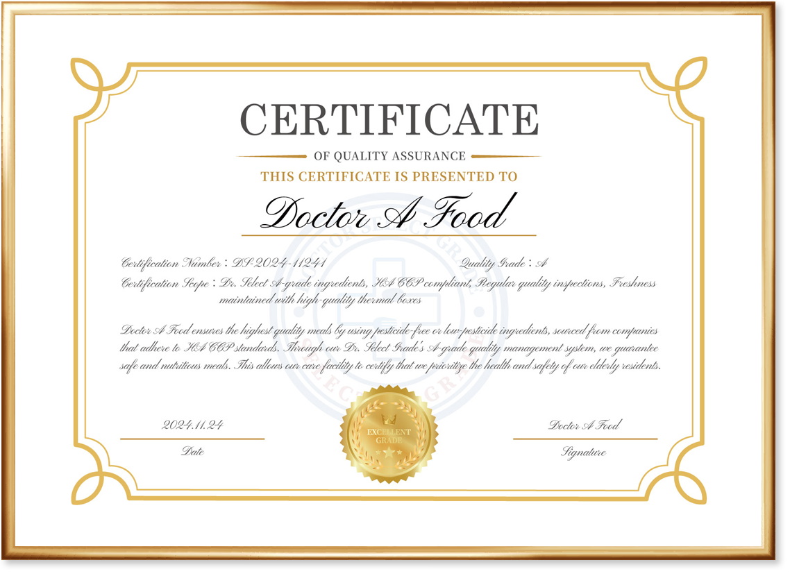 닥터 셀렉트 품질표준에 따라 발행되며, 요양원의 어르신들에게 최상의 신뢰성과 품질을 보장하는 식사를 제공하고 있음을 증명합니다.