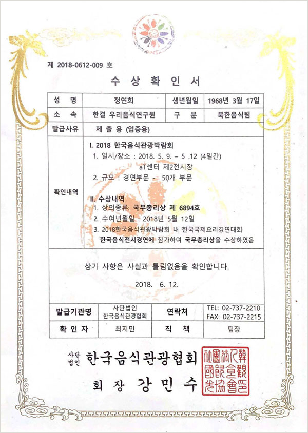 한국국제요리경연대회 북한음식부분에서 탁월한 요리 실력을 인정받아 국무총리상을 수상했습니다.
