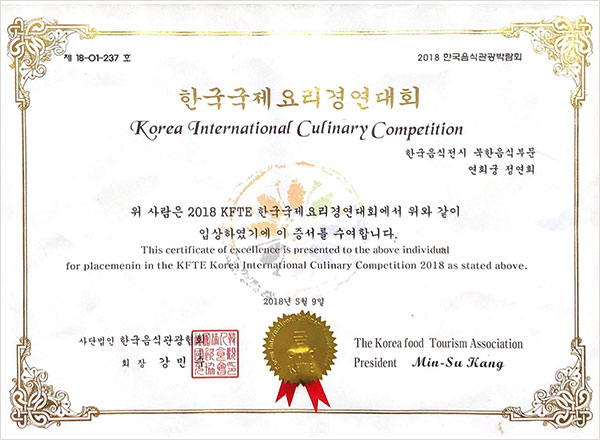 한국국제요리경연대회 한국음식전시 북한음식 부문에서 우수한 성과를 거두며 전통 북한 요리의 가치를 인정받았습니다.