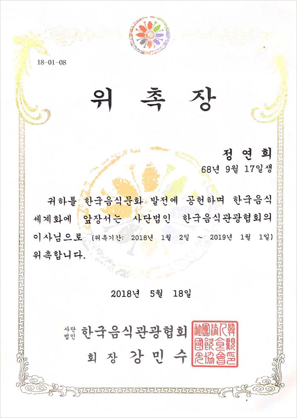 한국 음식 문화 발전에 크게 기여하였고, 이를 통해 한국 음식의 세계화를 선도하는 공로를 인정받아 위촉장을 수여했습니다.